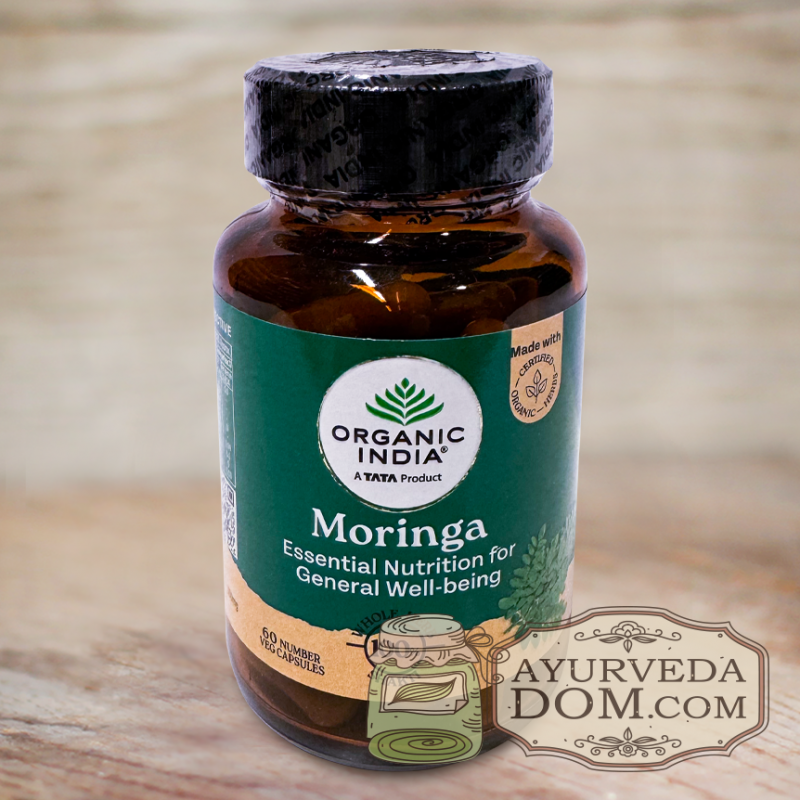 Moringa (Moringa oleifera) — одно из самых питательных растений на Земле, известное в аюрведе как «шигру» и почитаемое за способность питать все семь тканей организма (дхату). Его листья содержат более 90 активных питательных веществ, включая растительный белок, витамины A, C, E, группу B, кальций, железо и антиоксиданты. Препарат Moringa Organic India производится из органически выращенных листьев моринги, высушенных в тени и переработанных при низких температурах для сохранения всех ценных веществ.