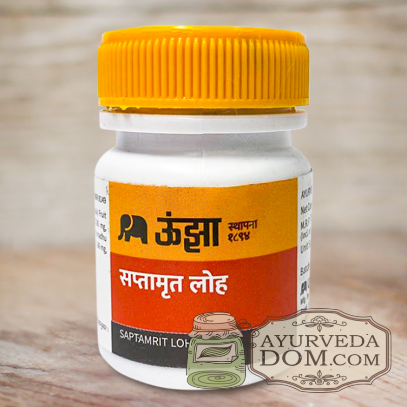 Saptamrit Loha Unjha — классический аюрведический препарат с очищенным железом (Lauha bhasma), трифалой и мулифти, применяемый при ослаблении зрения, головных болях и нервном истощении. Название «Саптамрит» означает «семикратный нектар» — символ гармонии, ясности и восстановления жизненной энергии (оджас).