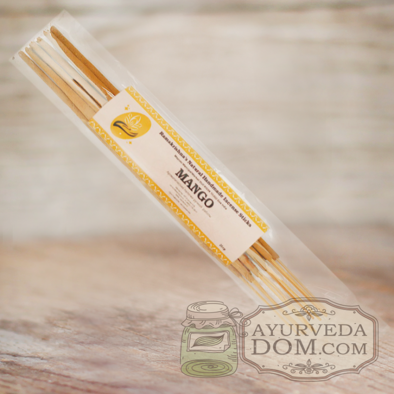 RamaKrishna MANGO (Рамакришна Манго) - авторские masala-благовония ручной работы от мастера РамаКришны из Гоа, продаваемые на рынке в Мапсе. Это не фабричная фруктовая «ароматизация», а плотная натуральная смесь на основе древесной муки, смол и эфирных масел, нанесённая вручную на бамбуковую лучину.